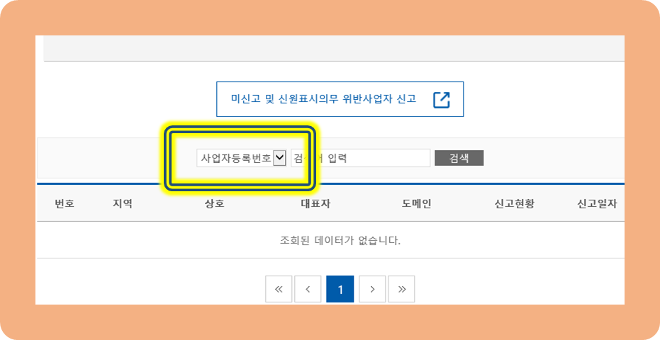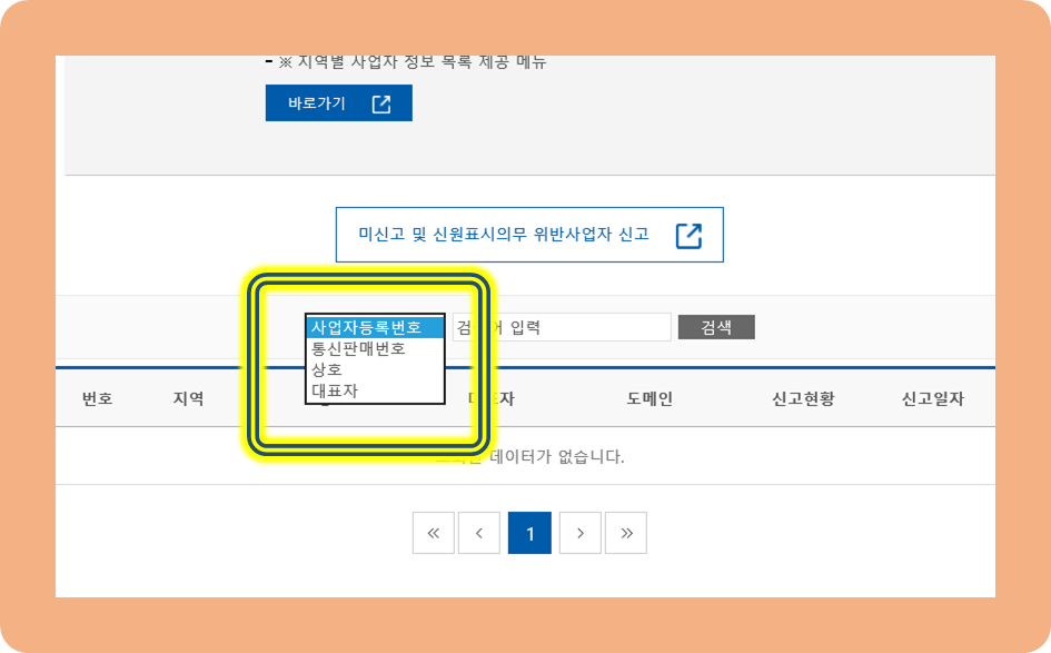 여기서 사업자 번호, 통신판매번호, 대표자, 상호 등 검색할 유형을 선택할 수 있습니다.