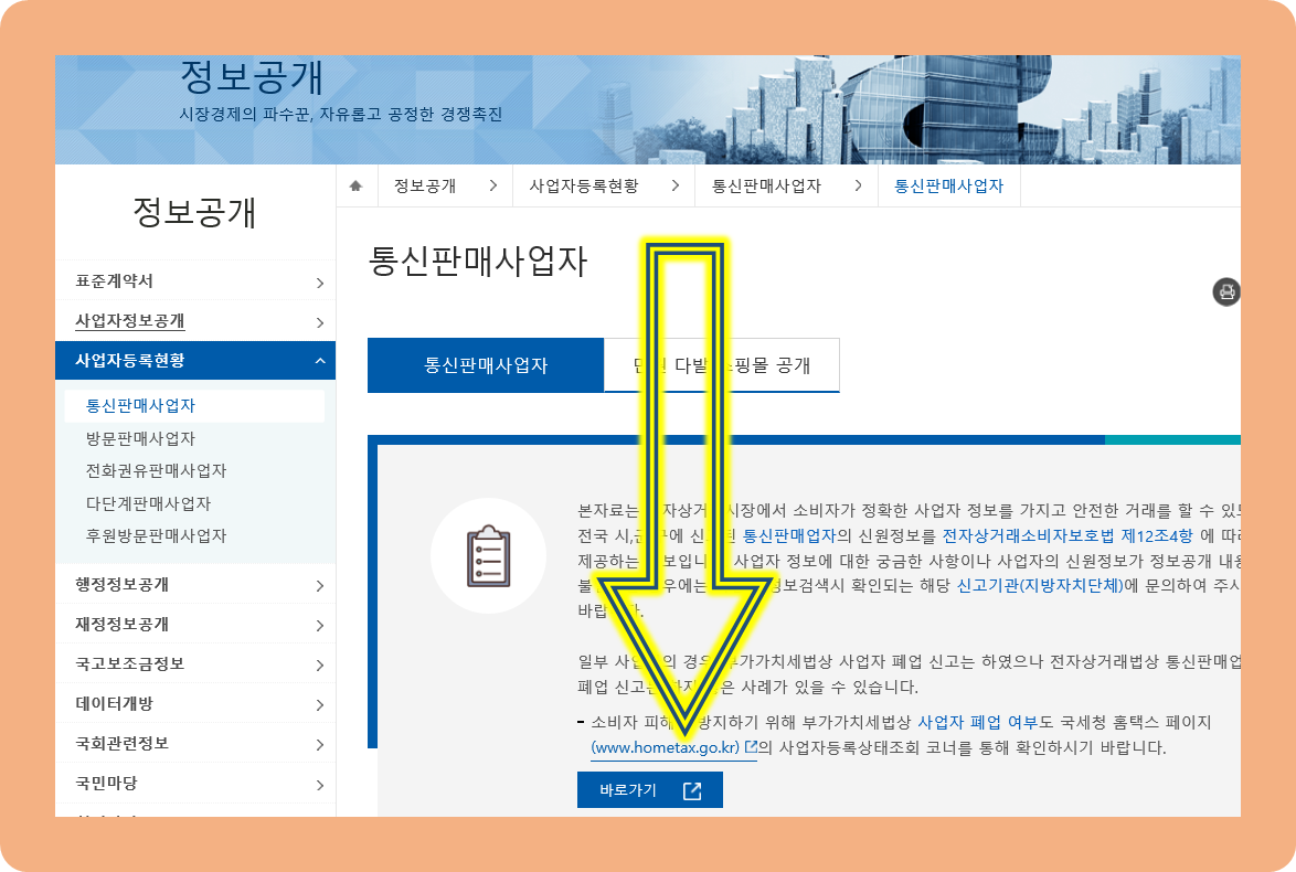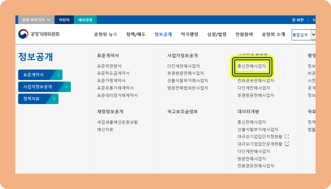 상단에 있는 정보공개를 먼저 누르신 후 통신판매사업자 메뉴를 순서대로 누르세요.