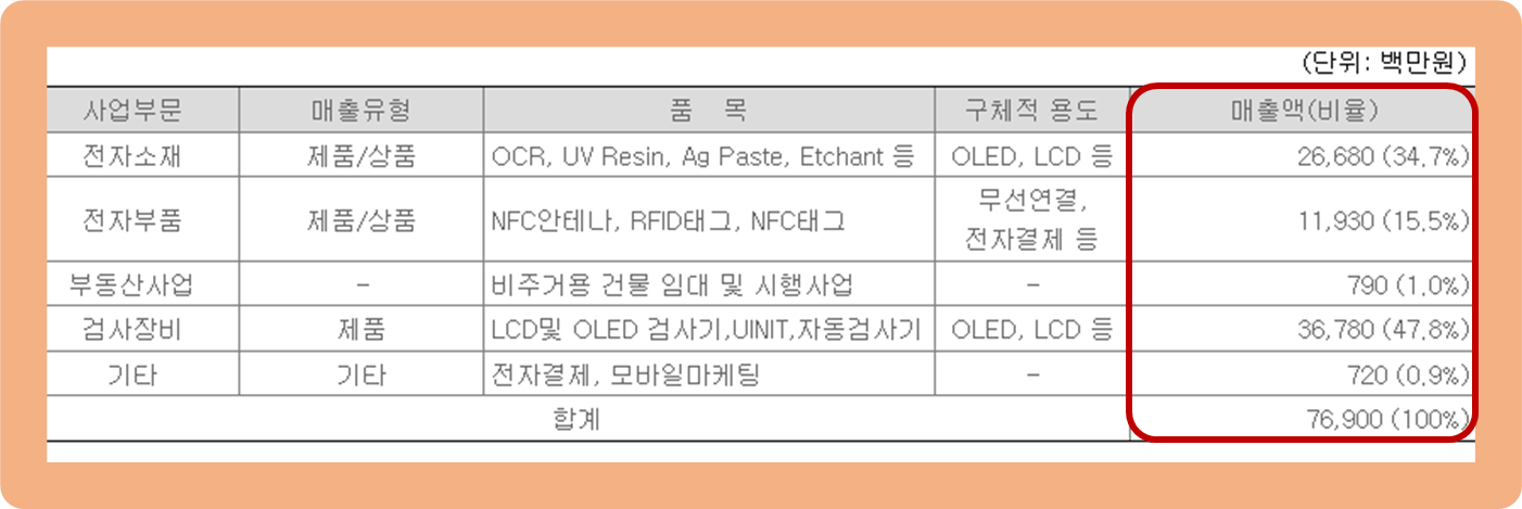 우선 검사장비(OLED, LCD 등) 부문이 약 47.8%로 가장 많은 비중을 차지하고 있구요.