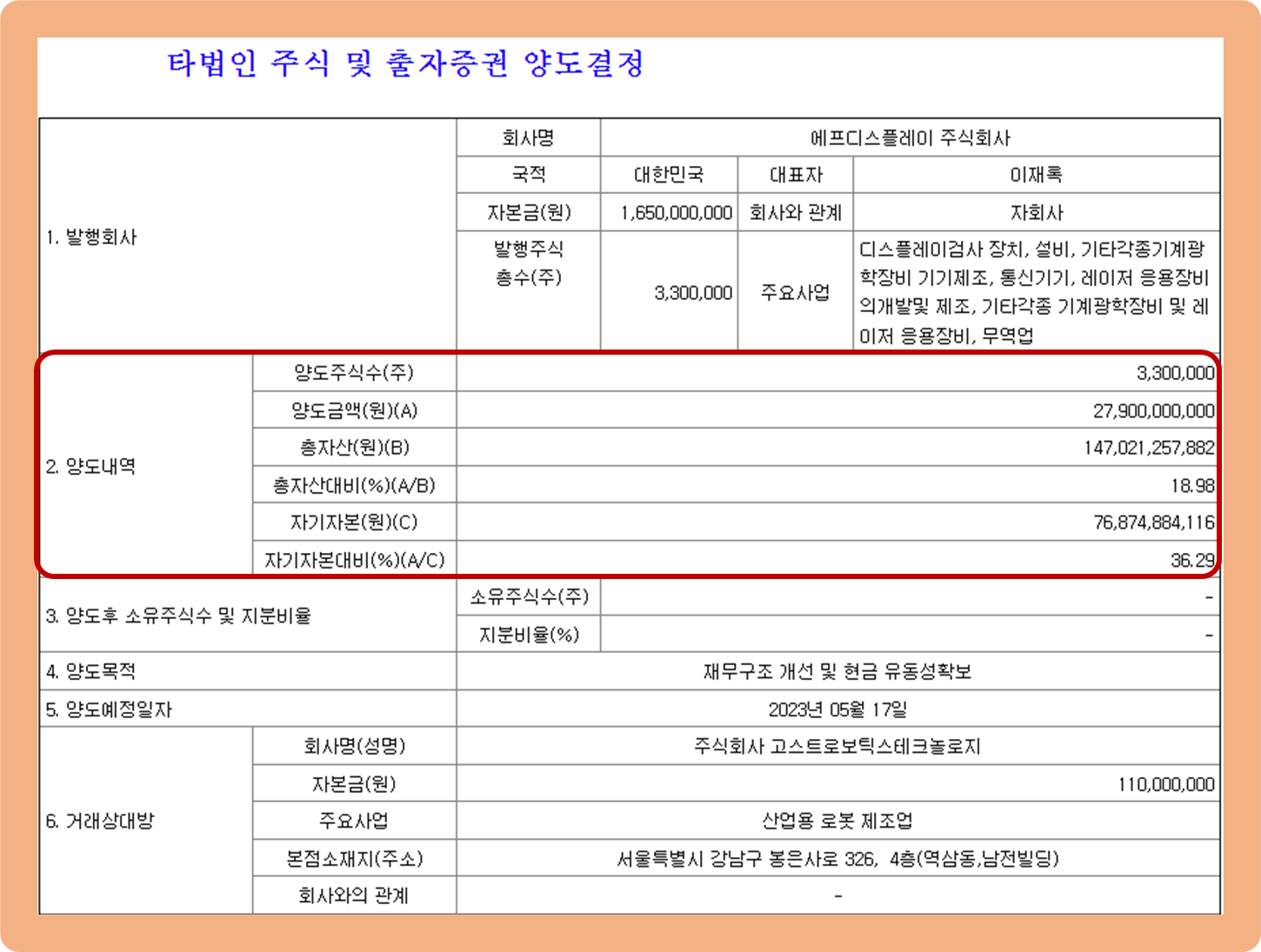 2023년 4월 19일, 소니드가 공시를 통해 자회사인 디스플레이 검사장비 기업인 에프디스플레이를 고스트로보틱스테크놀로지에 매각했다는 내용을 발표했습니다.
