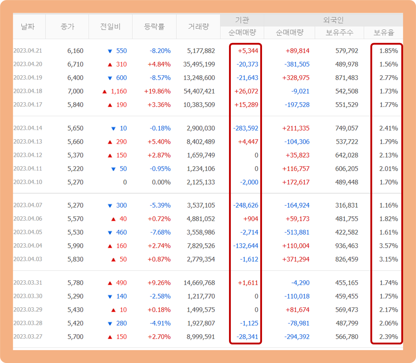 우선 기관투자자의 경우 지난 1개월 간 매도세가 매수세에 비해 압도적인 우위를 점하고 있구요.