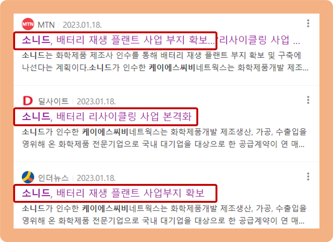 이 소식에 앞서 지난 2023년 1월 10일 소니드는 미국 기업 리사이클리코 배터리 머터리얼즈와 MOU을 체결하며 배터리 리사이클링 사업 진출을 선언한 바 있는데요.
