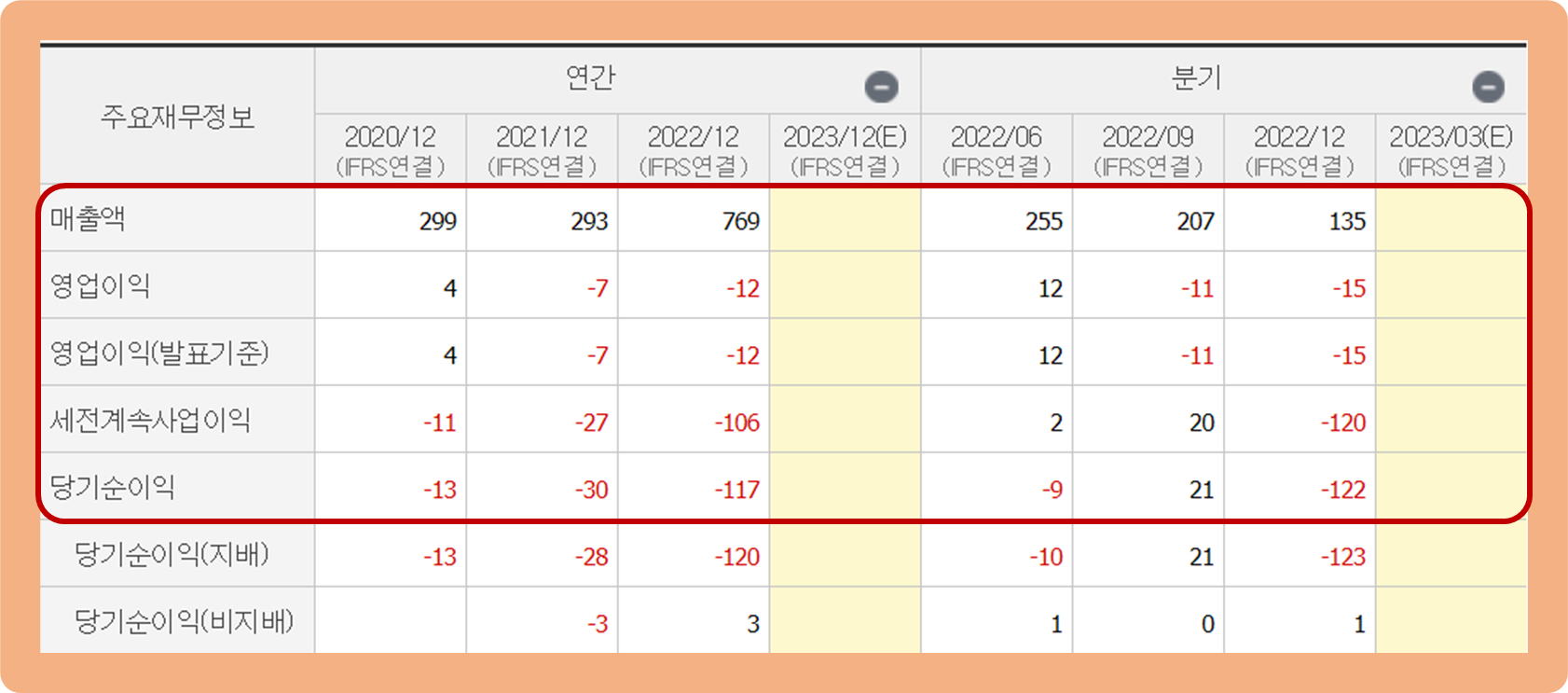 연간 당기순이익 지난 2022년 기준 약 -117억원 손실을 기록하며 적자 행진을 기록함과 동시에 손실 폭이 더욱 커진 상황입니다.
