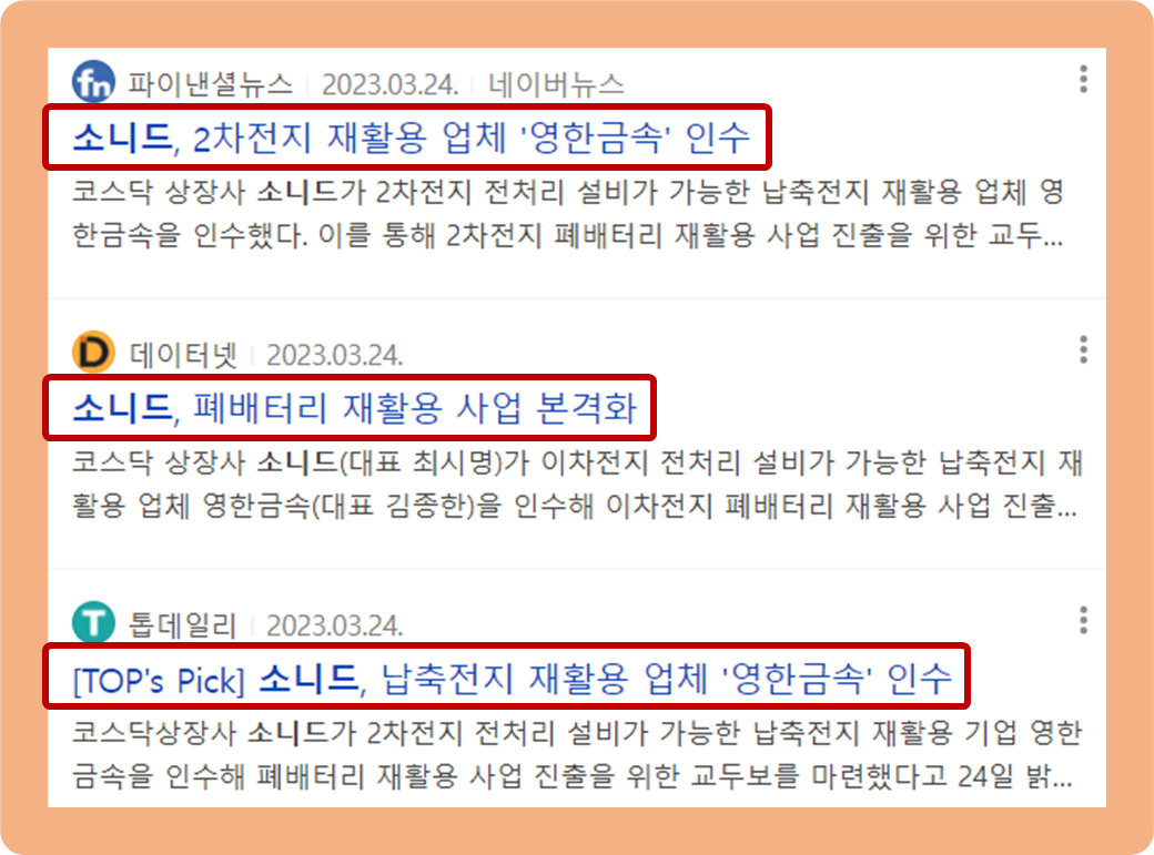 2023년 3월 24일, 소니드가 이차전지 폐배터리 재활용 사업 진출을 목적으로 영한금속(납축전지 재활용 기업)을 인수했다는 소식이 발표되었습니다.