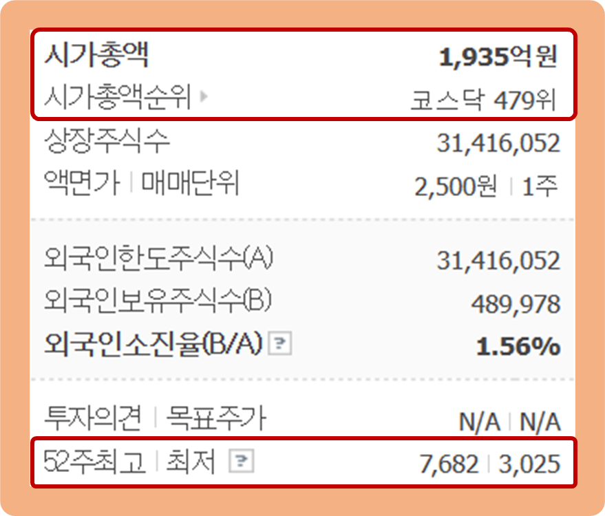 52주 최고가는 7,682원이며, 52주 최저가는 3,025원이네요.