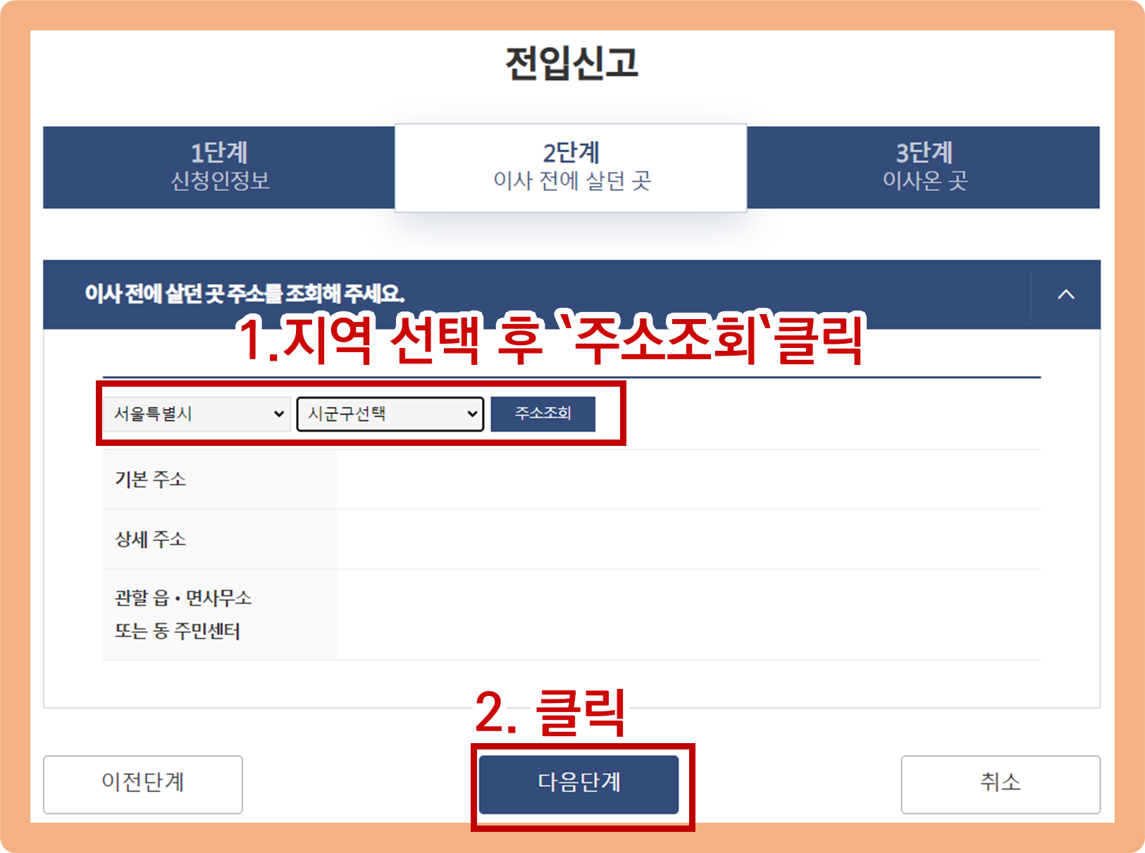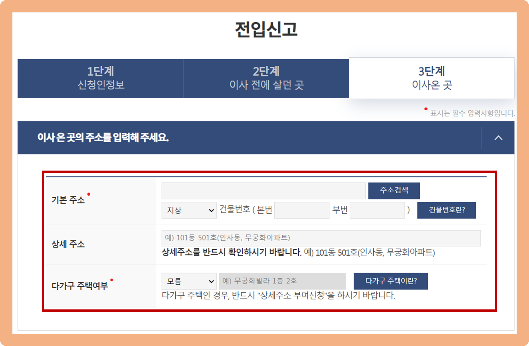 그 다음으로는 이사 온 곳의 주소 등 정보를 입력해줘야 하는데요.