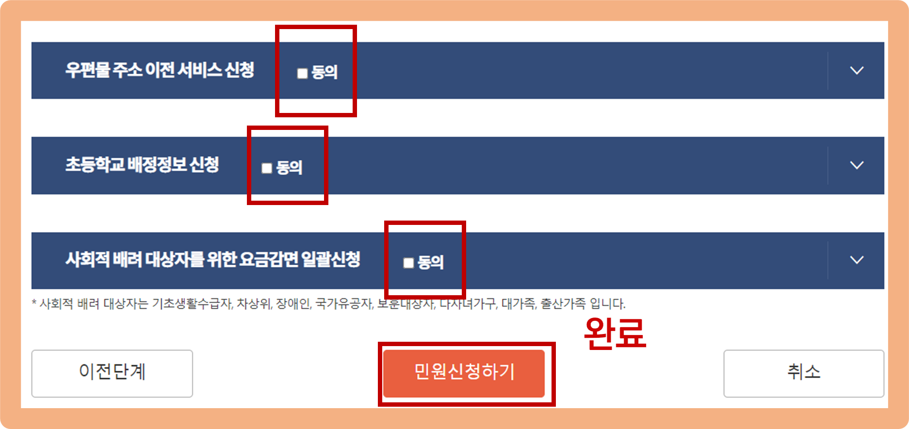 그리고 화면을 아래로 내리시면 우편물 주소 이전 서비스, 초등학교 배정 정보, 사회적 배려 대상자 대상 요금감면 일괄 신청 동의 여부를 체크해주시구요.