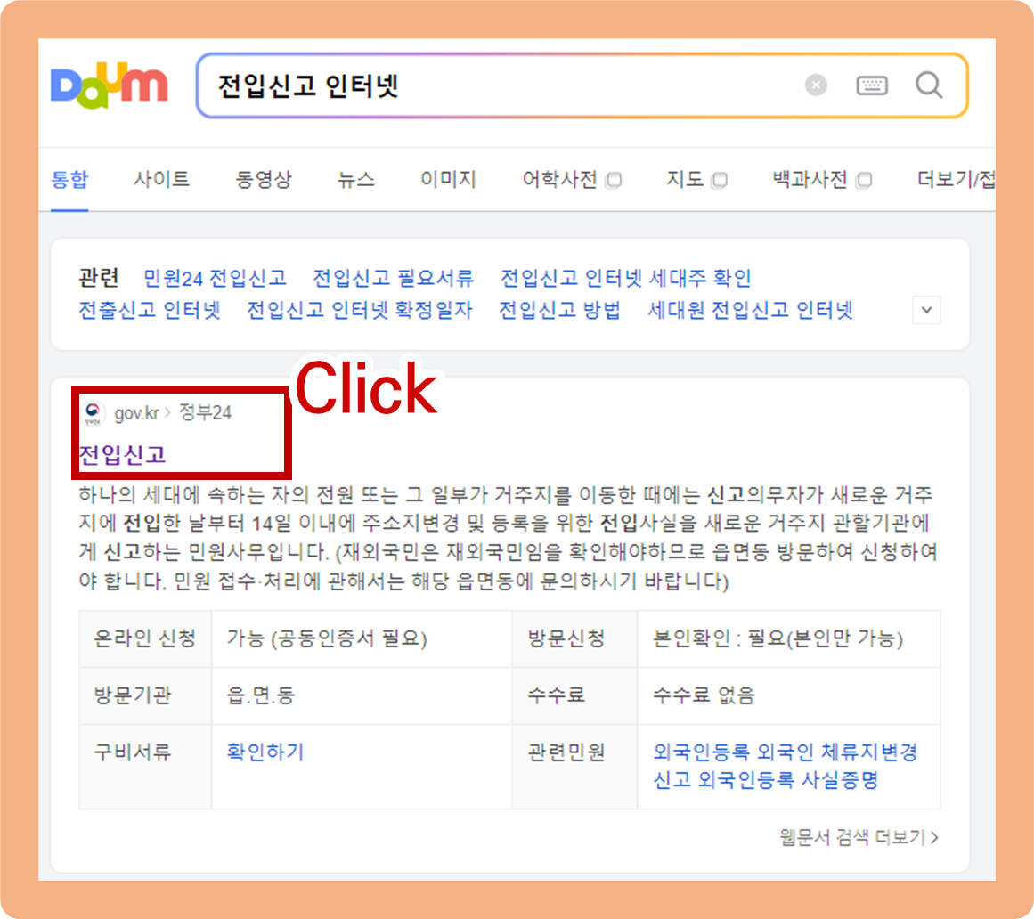 우선 검색창에 '전입신고 인터넷'을 입력해주세요.