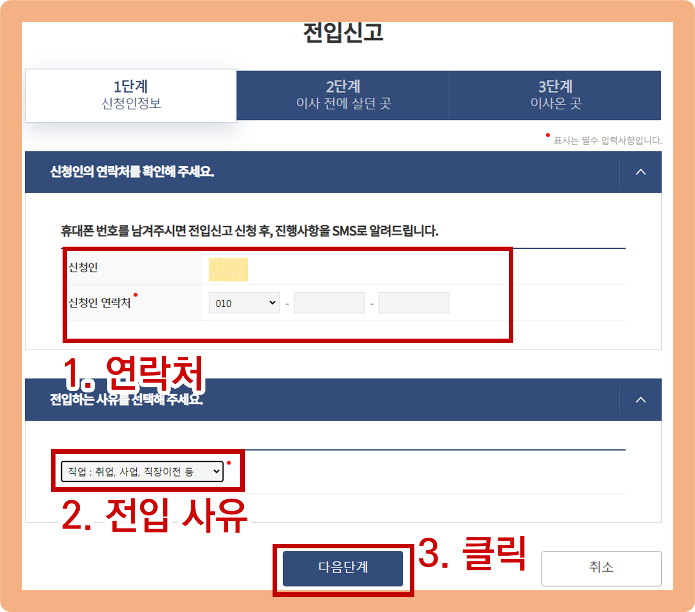 먼저 신청인 분의 연락처를 입력해주시구요.