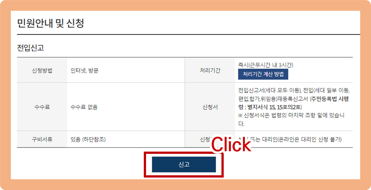 맨 밑에 '민원신청하기' 버튼을 눌러주시면, 전입신고가 완료돼요.