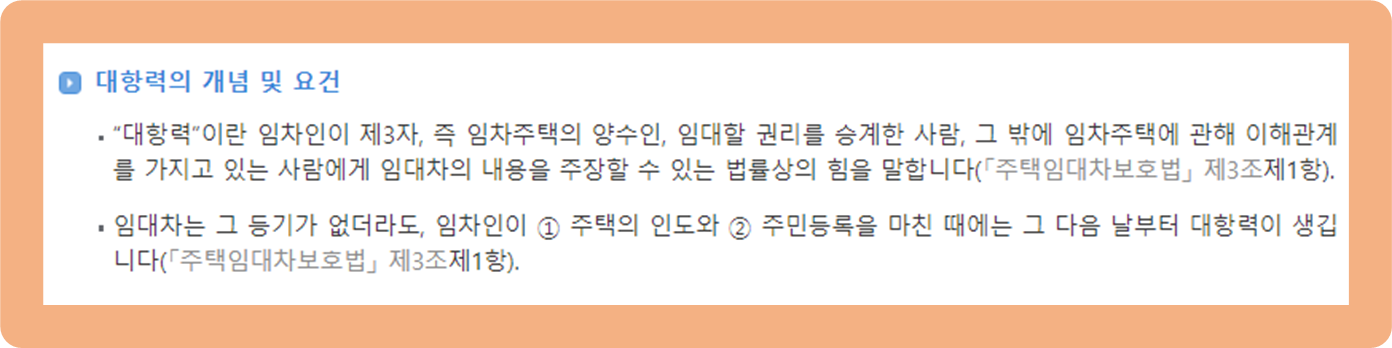 예를 들어 대항력을 갖게 되면, 나도 모르게 집 소유자가 변경되었더라도 '나는 임대차계약서상 이 집에 거주할 권리가 있다'는 것을 주장하며 해당 주택에 계속해서 거주할 수 있게 해주는 것이죠.