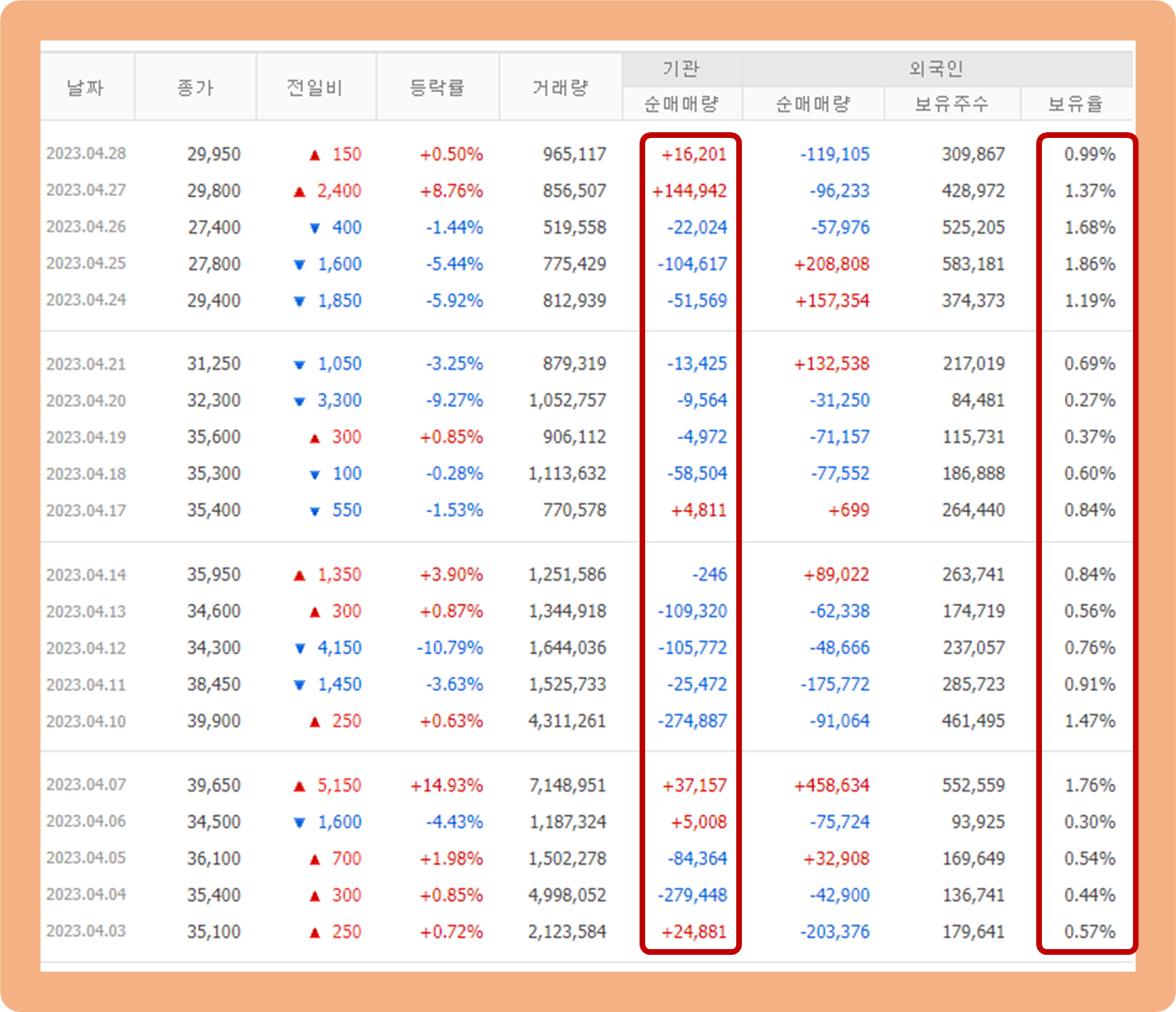 우선 기관투자자의 경우 지난 한 달 간 매도세가 매수세에 비해 압도적인 우위를 점하고 있구요.
