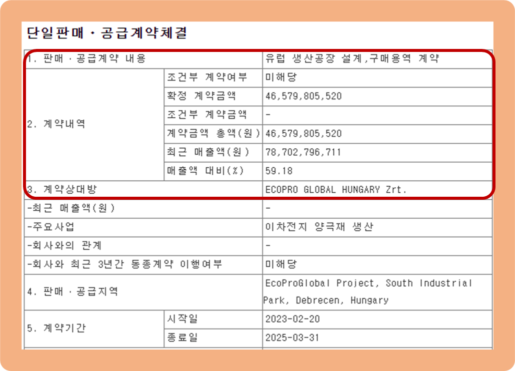 2023년 2월 21일, 제이오가 에코프로비엠 헝가리 법인과 약 466억원 상당의 유럽 생산공장 설계, 구매 용역 계약을 맺었다는 공시를 발표했습니다.