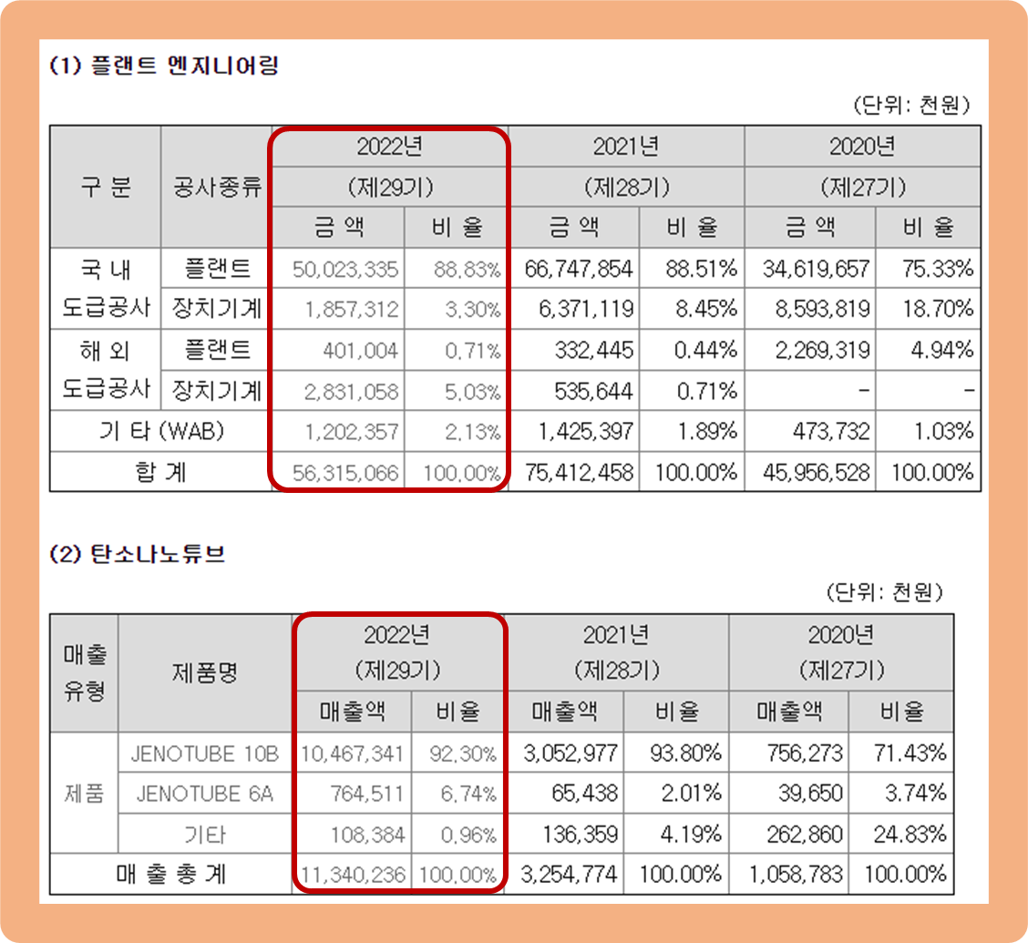 최근 사회적으로 나노신소재 부문이 주목을 받고 있는데, 아직은 플랜트 엔지니어링 부문 매출이 압도적으로 높은 모습이네요.