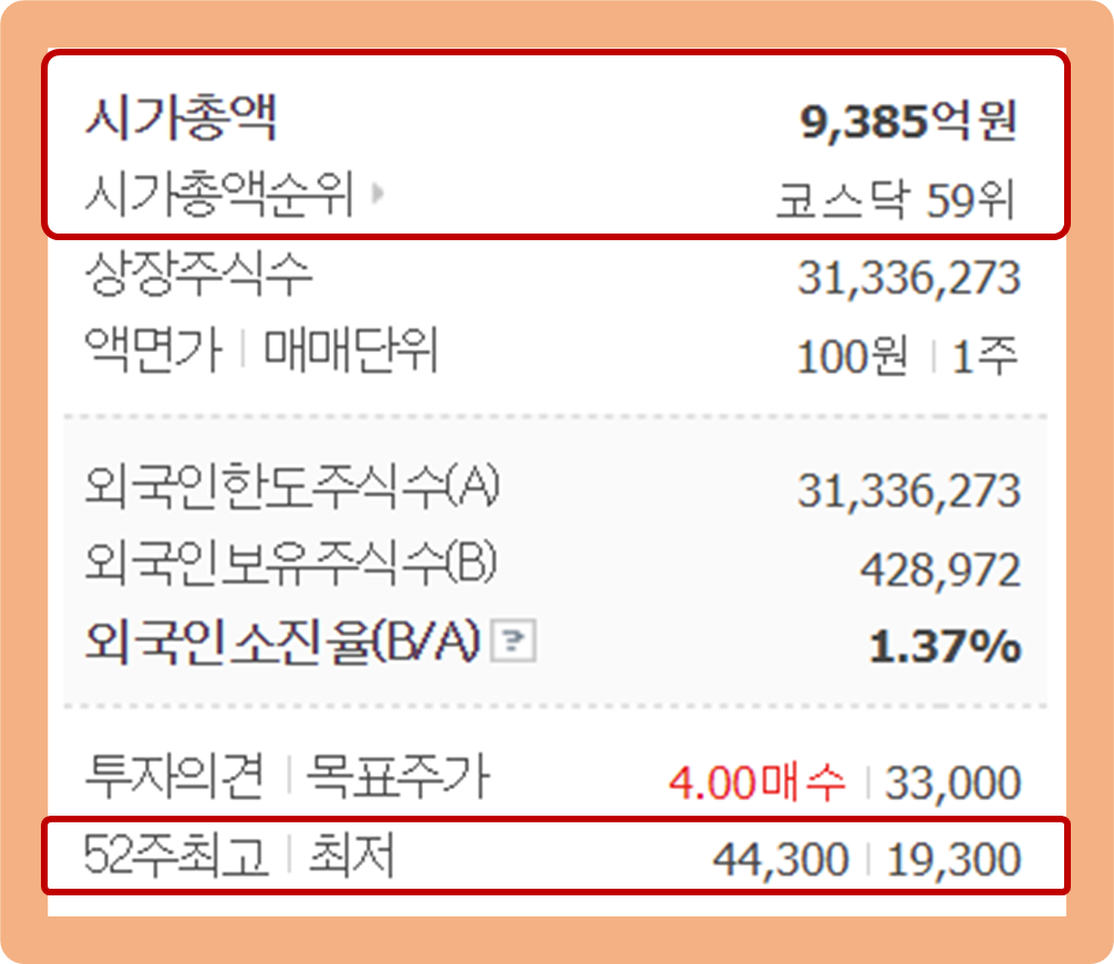 52주 최고가는 44,300원이며, 52주 최저가는 19,300원이네요.
