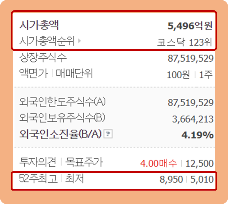 52주 최고가는 8,950원이며, 52주 최저가는 5,010원이네요.