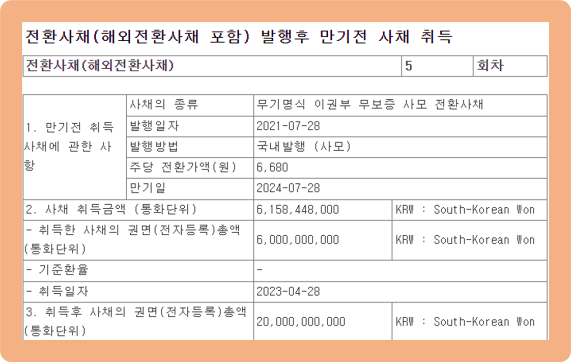 콜옵션을 행사해 만기 전 취득하게 된 것인데요. 향후 소각 또는 재매각을 진행할 예정이라고 하네요.