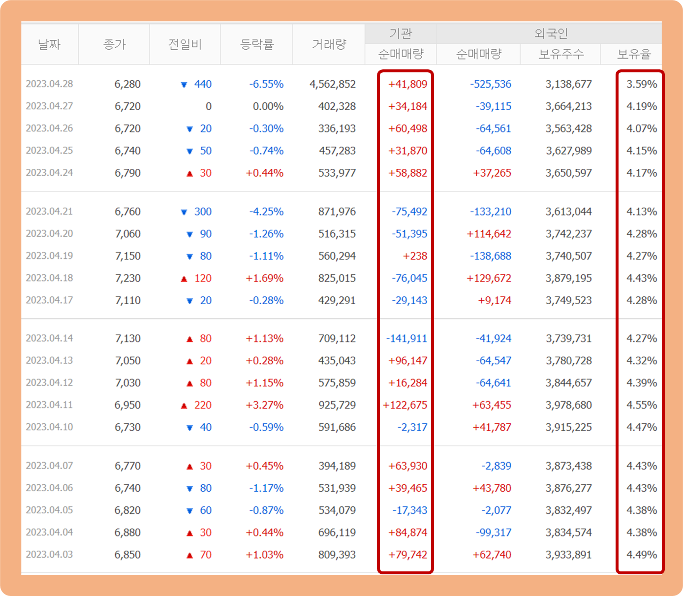 지난 1개월 간 기관투자자 및 외국인 투자자 지분율에 대해 보도록 하겠습니다.