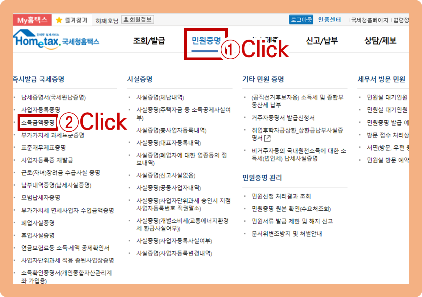 소득금액증명원 인터넷 발급 방법, 민원증명 → 소득금액증명
