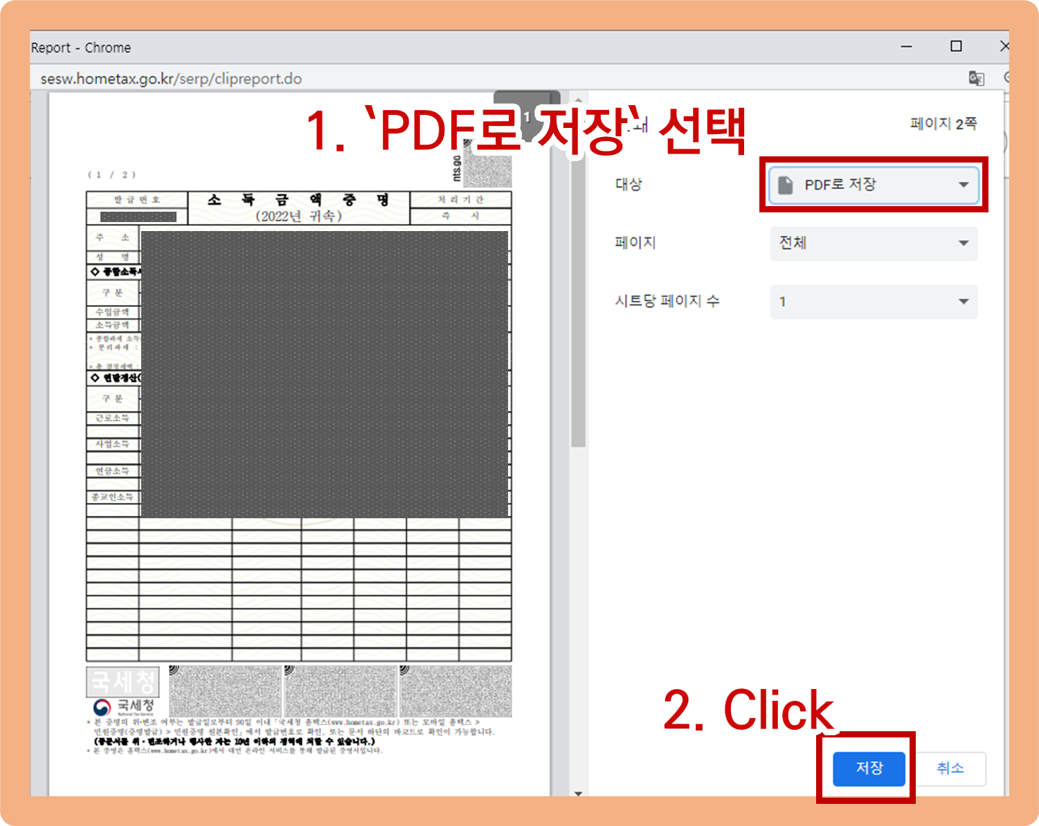 PDF 파일로 저장하실 분들은 위에 대상에서 'PDF로 저장'을 선택해주신 후, 오른쪽 아래에 있는 '저장'버튼을 누르시면 완료돼요.