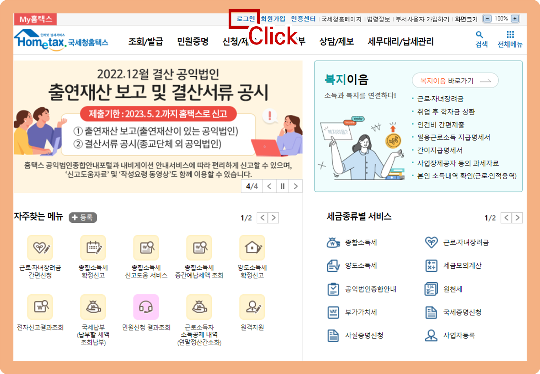 이를 클릭해서 '홈택스 홈페이지'로 들어가주세요.