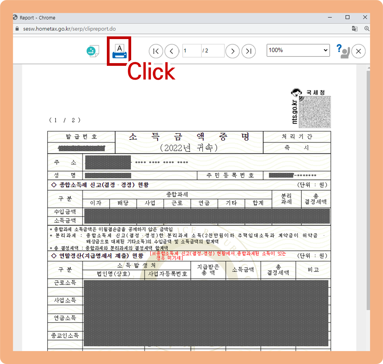 소득금액증명원 인터넷 발급 방법, 출력 누르기