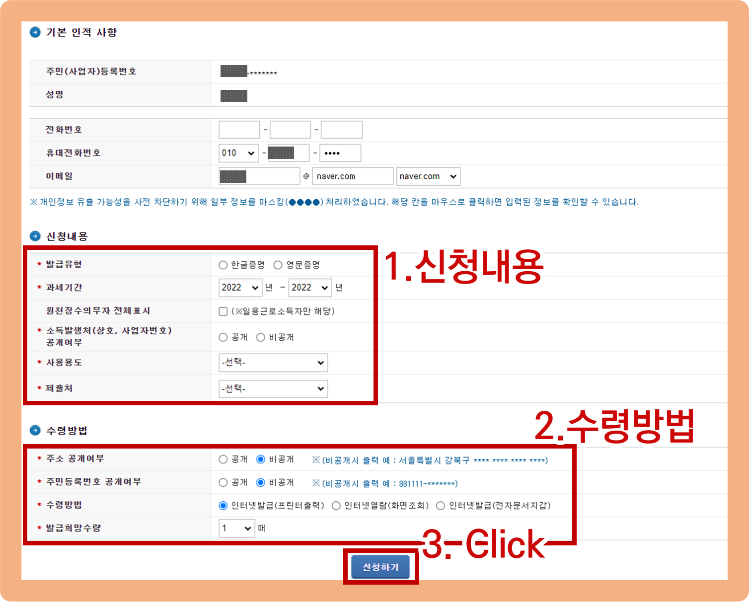 소득금액증명원 인터넷 발급 방법, 개인 정보, 신청내용, 수령 방법 선택