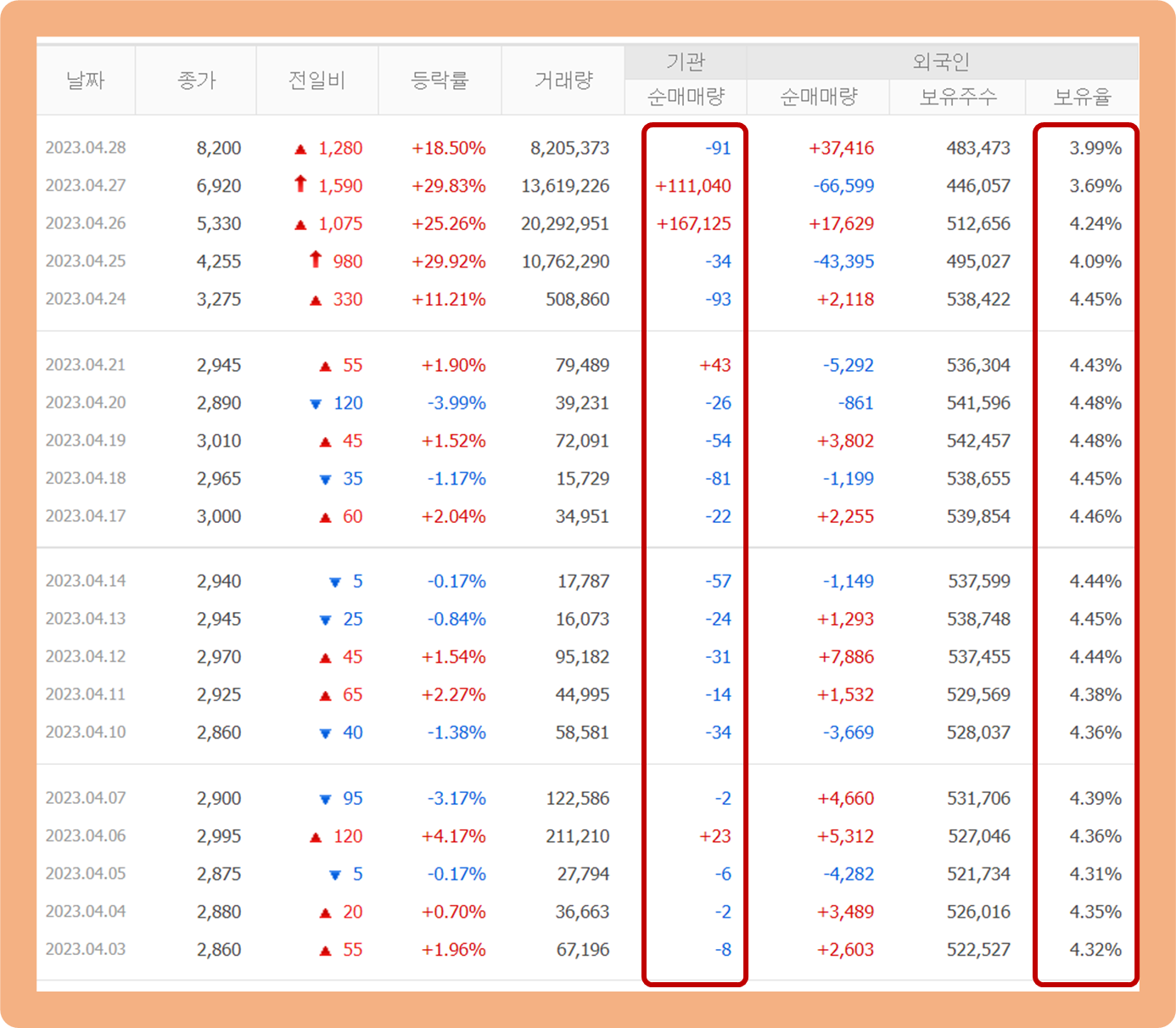 기관투자자의 경우 한 달 내내 거래량의 거의 없다시피 했는데, 최근 테슬라 희토류 사용 중단 및 윤대통령 일론 머스크 회동 관련 소식이 퍼지면서 매수세가 급격히 많아졌구요.