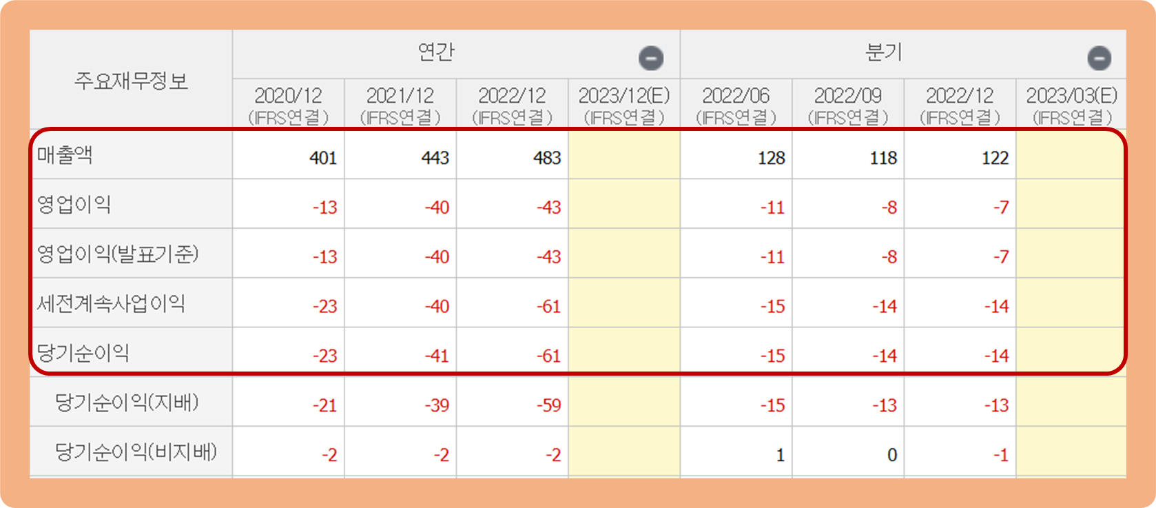 그리고 2022년 기준 연간 영업이익과 당기순이익은 각 -43억원, -61억원 손실을 기록하며, 최근 수 년 동안 적자행진을 이어감과 더불어 전년에 비해 손실 폭까지 더 커진 상황이네요.