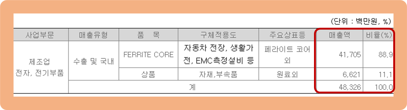 우선 페라이트 코어 부문(자동차 전장, 생활가전, EMC 측정 설비 등)이 약 88.9% 수준으로 총 매출의 대부분을 책임지고 있구요.