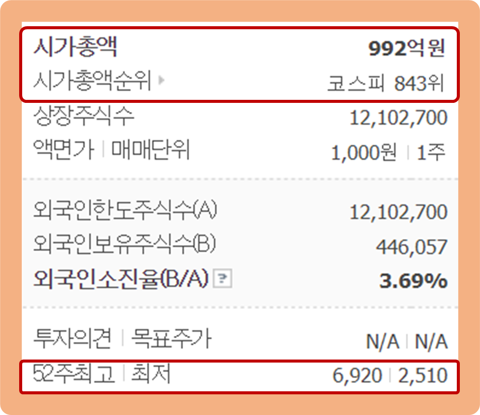 52주 최고가는 6,920원이며, 52주 최저가는 2,510원이네요.