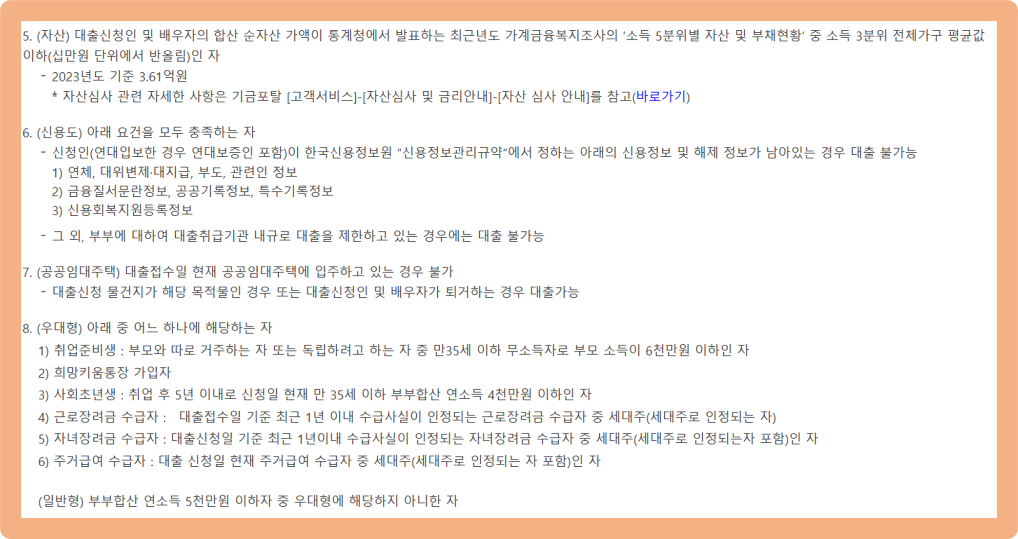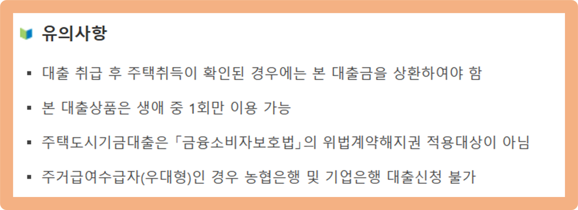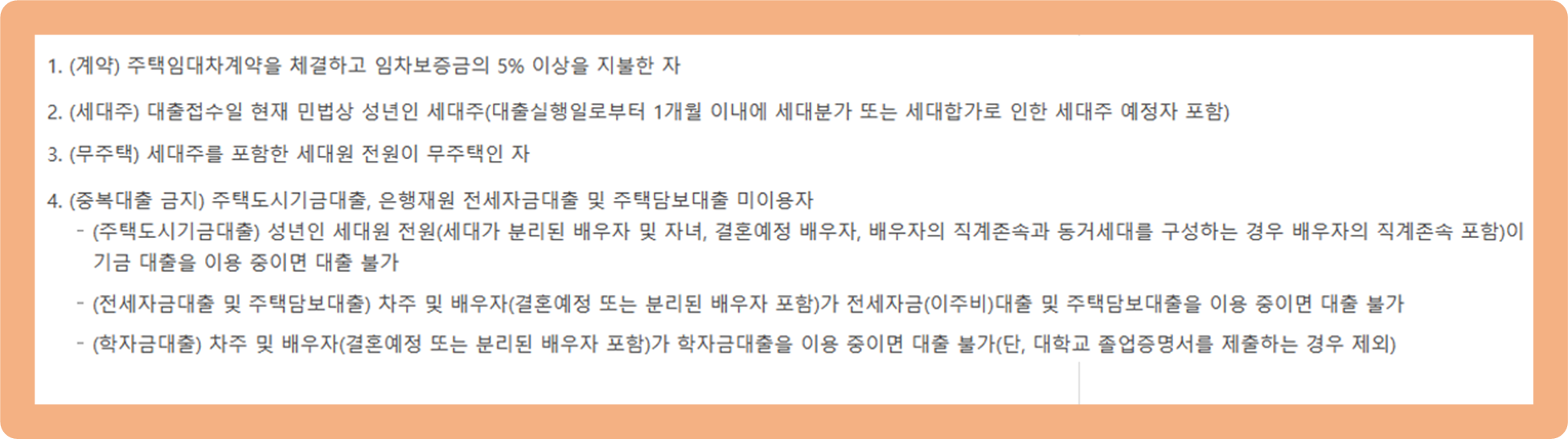 4. 주택도시기금대출, 은행재원 전세자금대출 및 주택담보대출을 이용 중이면 대출을 신청할 수 없어요.