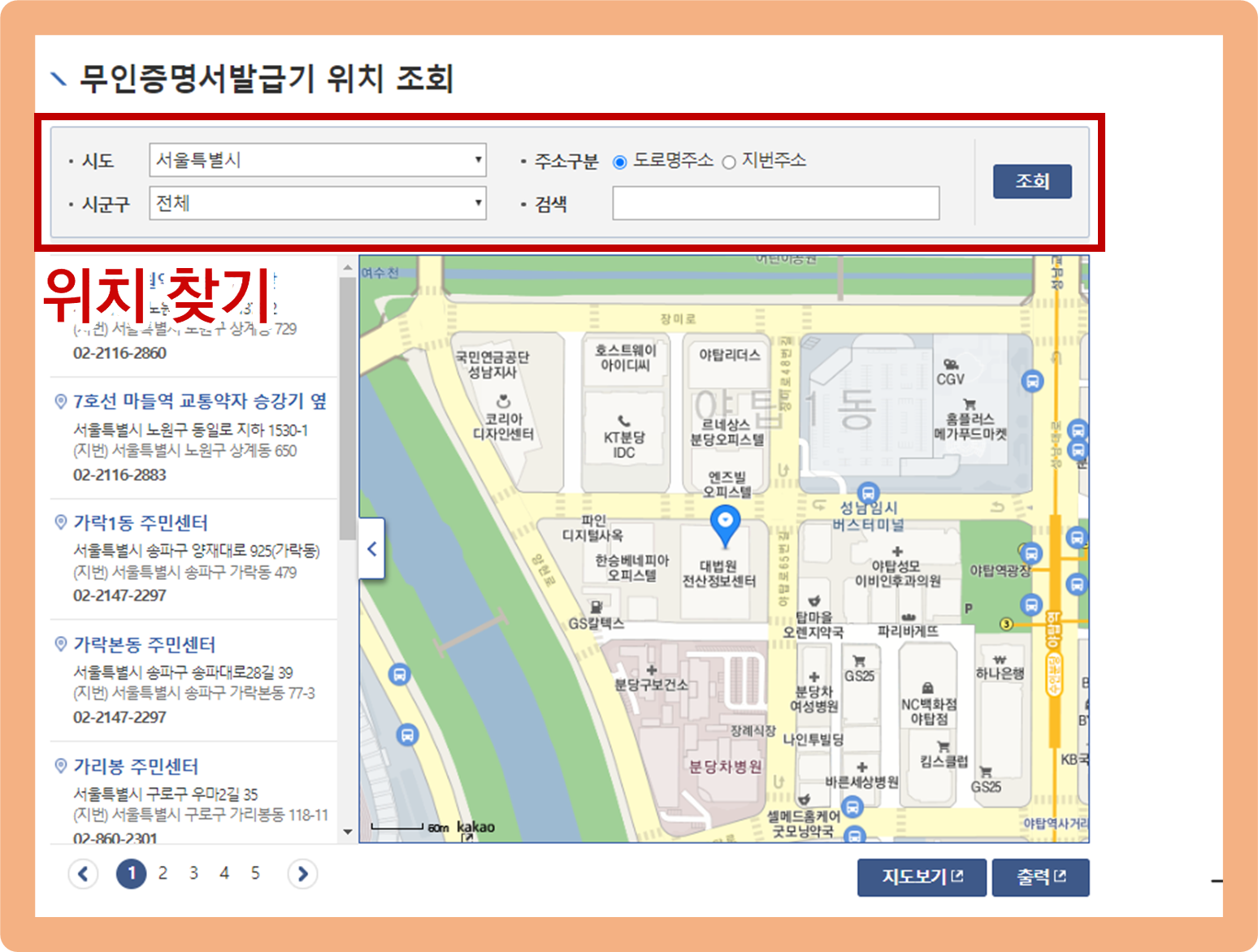 여기서 현재 여러분이 계신 곳과 가장 가까운 무인발급기 위치를 찾아서 발급하시면 돼요.