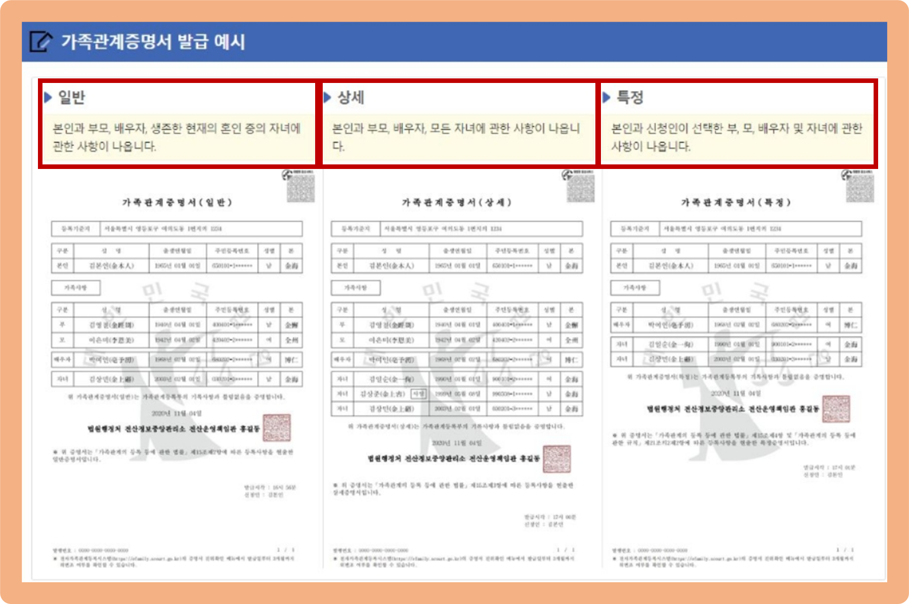 - 특정 : 본인과 신청인이 선택한 부, 모, 배우자 및 자녀 사항