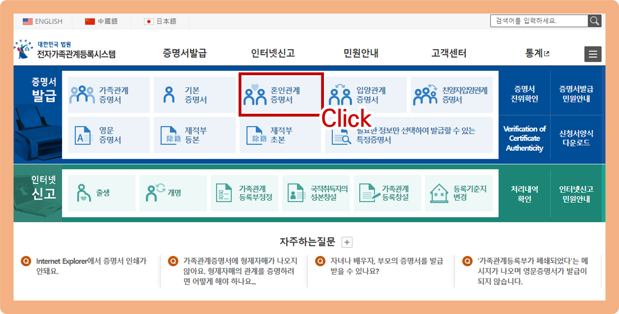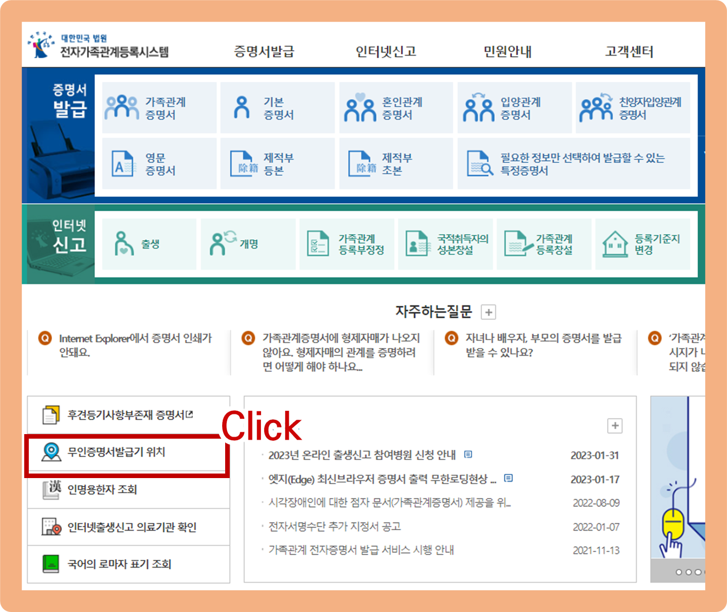 혼인관계증명서 무인발급기, '전자가족관계등록시스템' 검색