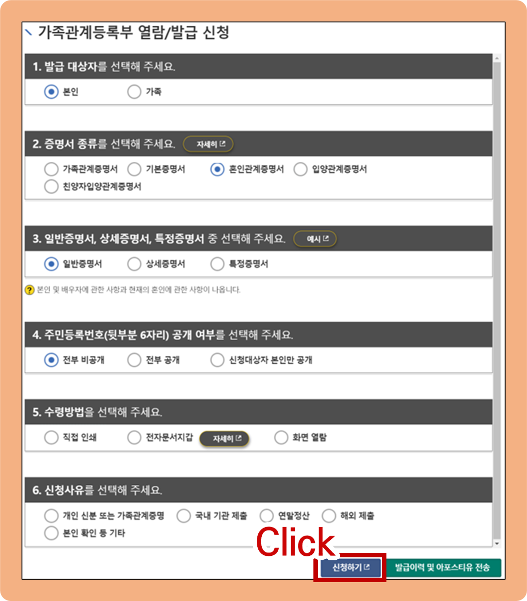 혼인관계증명서 상세 인터넷 발급, 선택사항 선택