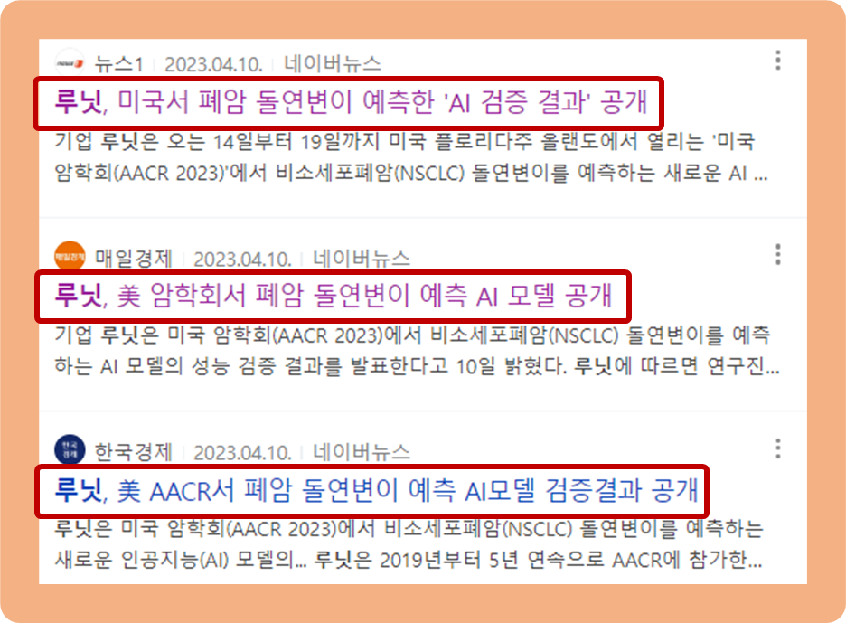 루닛이 2023년 14일~19일 미국 플로리다주 올랜도에서 진행된 '미국 암학회 2023'에서 '비소세포폐암 돌연변이'를 예측하는 신규 AI 모델의 성능 검증 결과를 발표했습니다.