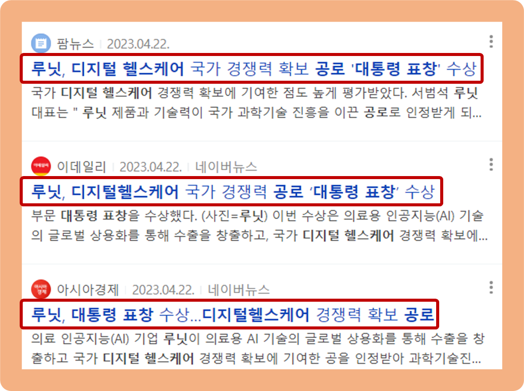 2023년 4월 21일 방송통신위원회와 과학기술정보통신부의 주최로 개최된 행서에서, 루닛이 과학기술진흥 부문 대통령 표창을 받았습니다.