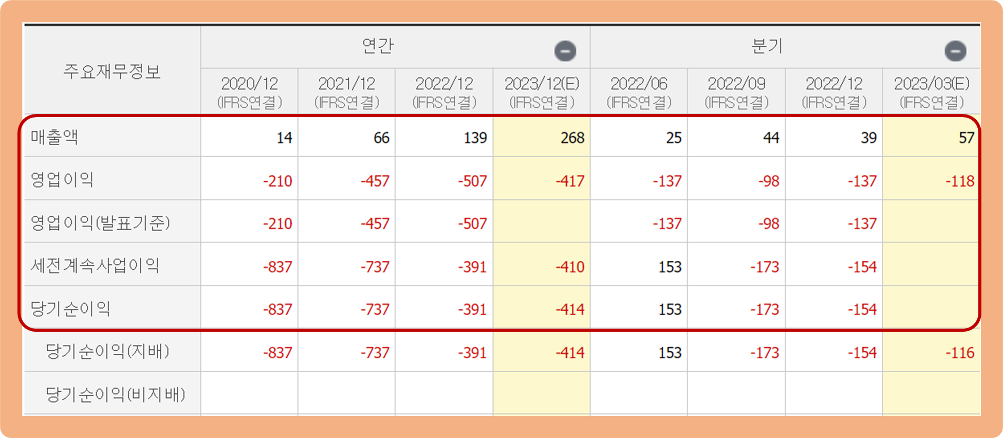 같은 기간 연간 영업이익과 당기순이익은 각 -507억원, -391억원 손실을 기록하며 지난 수년 동안 계속해서 적자행진을 이어오고 있는 모습이네요.
