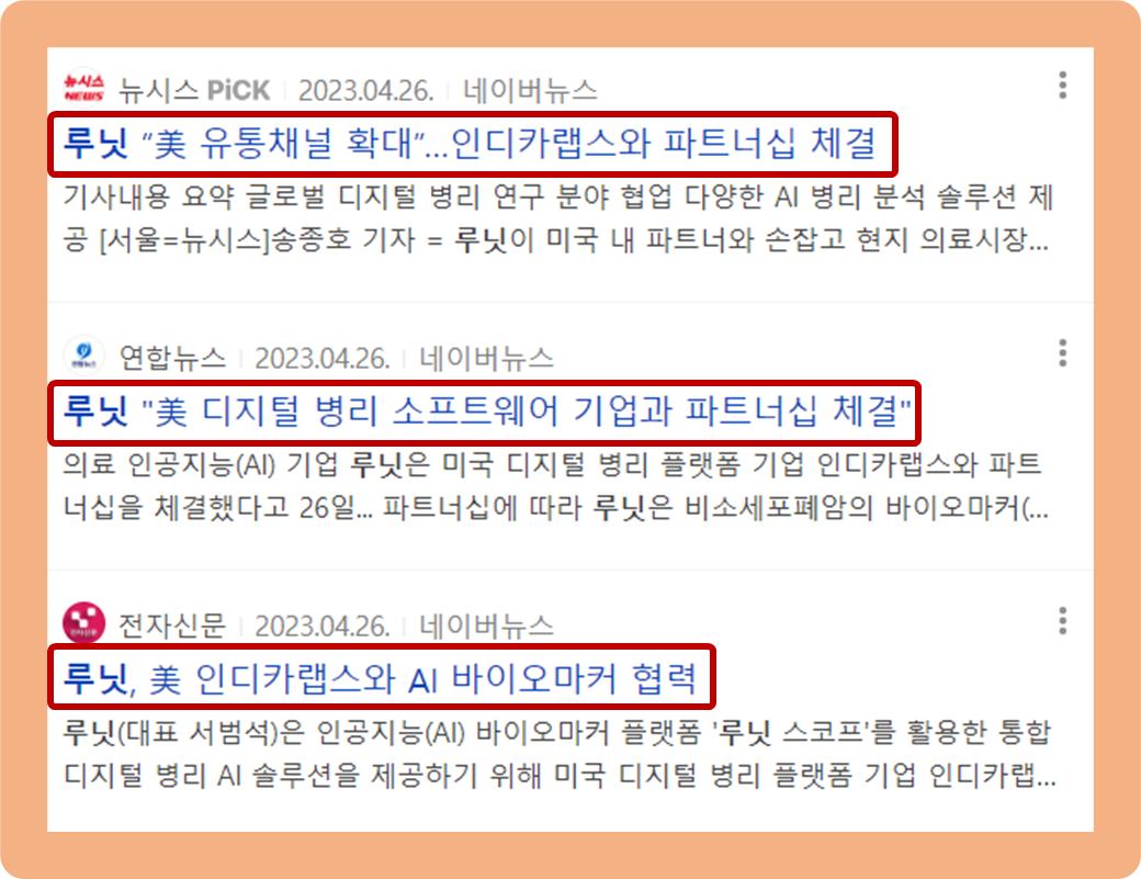 2023년 4월 26일, 루닛이 미국의 디지털 병리 플랫폼 업체인 인디카랩스와 파트너십을 맺었습니다.