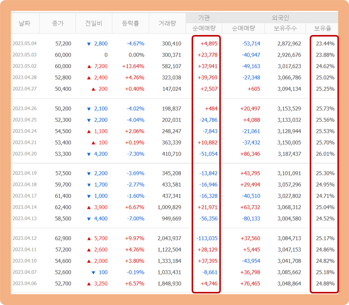 외국인 투자자 지분율의 경우 지난 1개월 간 약 23~25%대를 유지하고 있는 모습이네요.