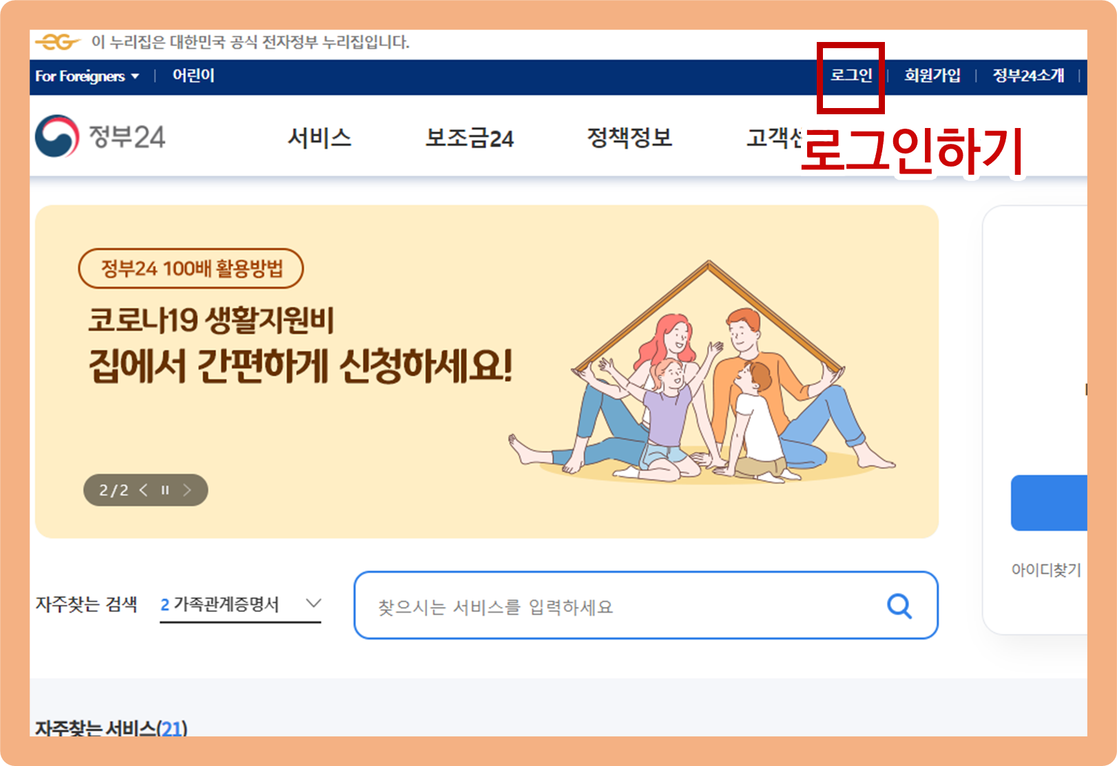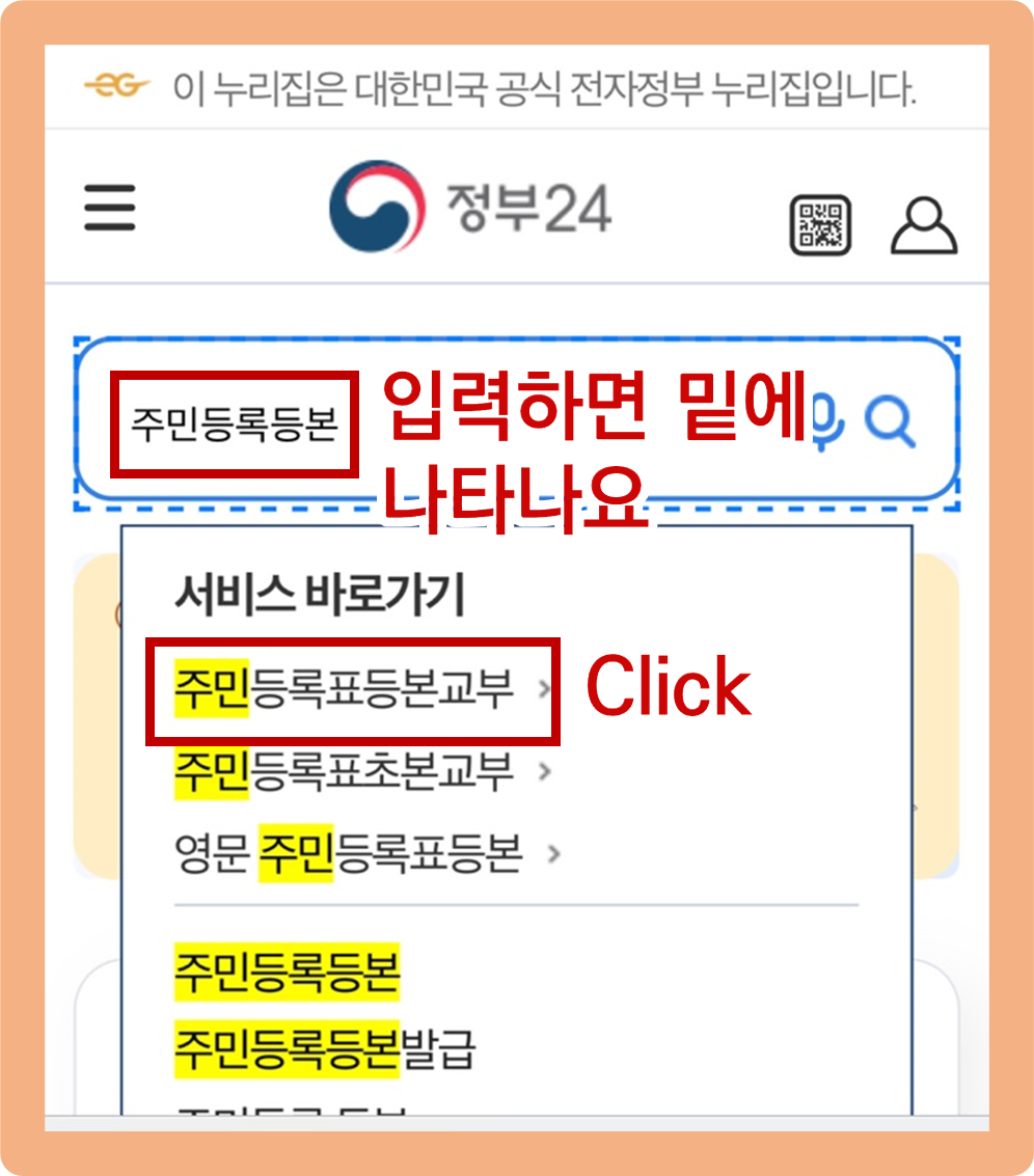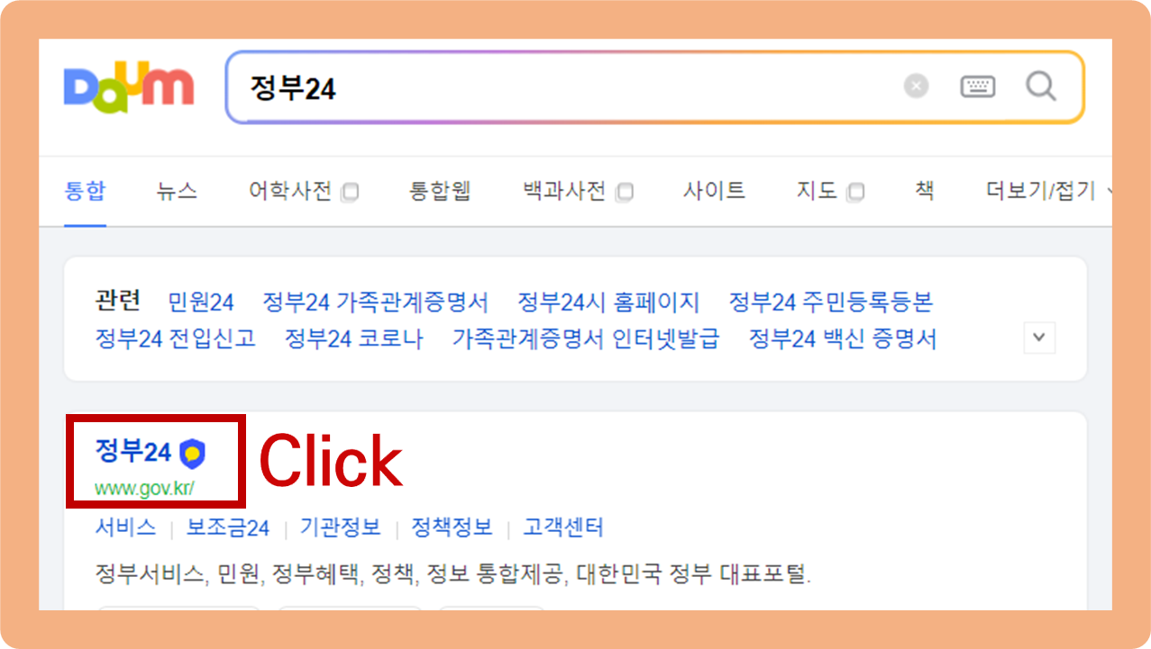 검색창에 '정부24'를 검색해주세요.