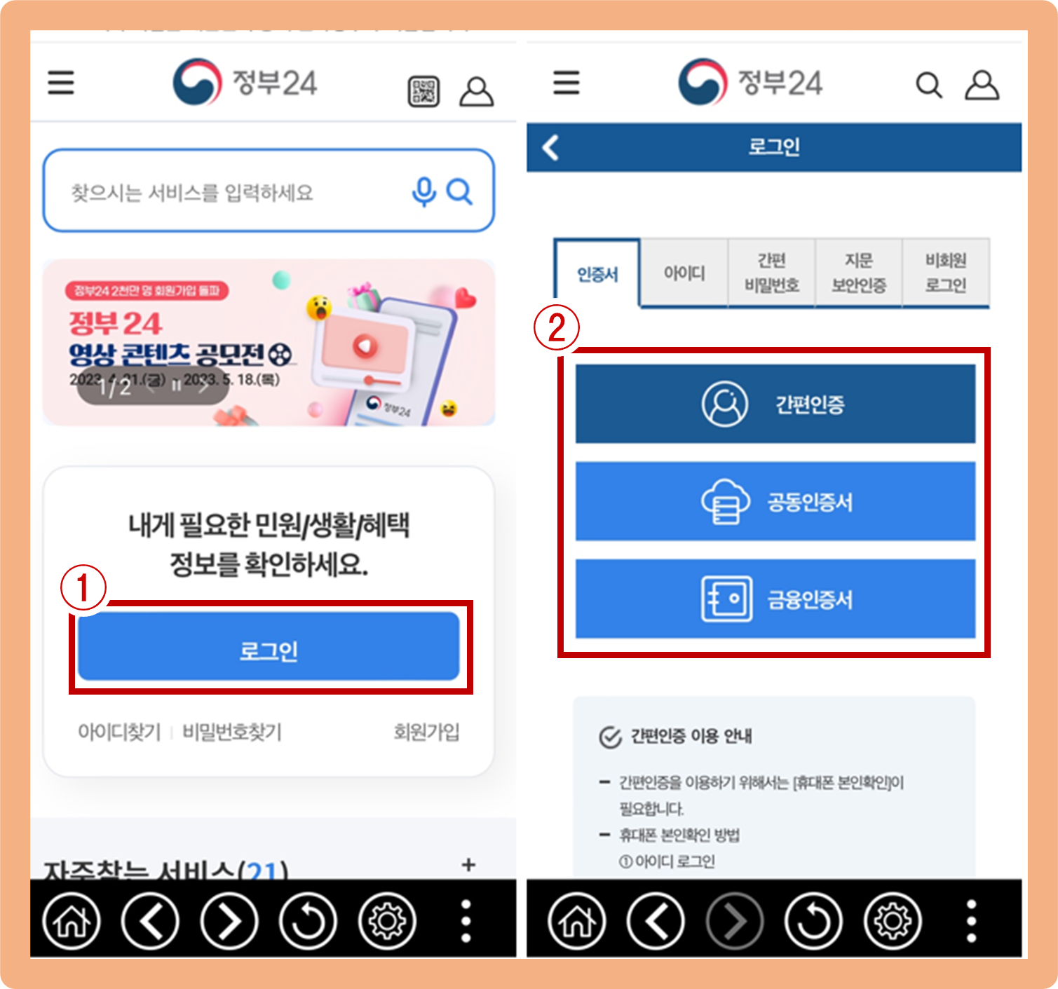 PC와 마찬가지로 간편인증 공동, 금융 인증서 등을 통해 본인 인증을 진행해주세요.