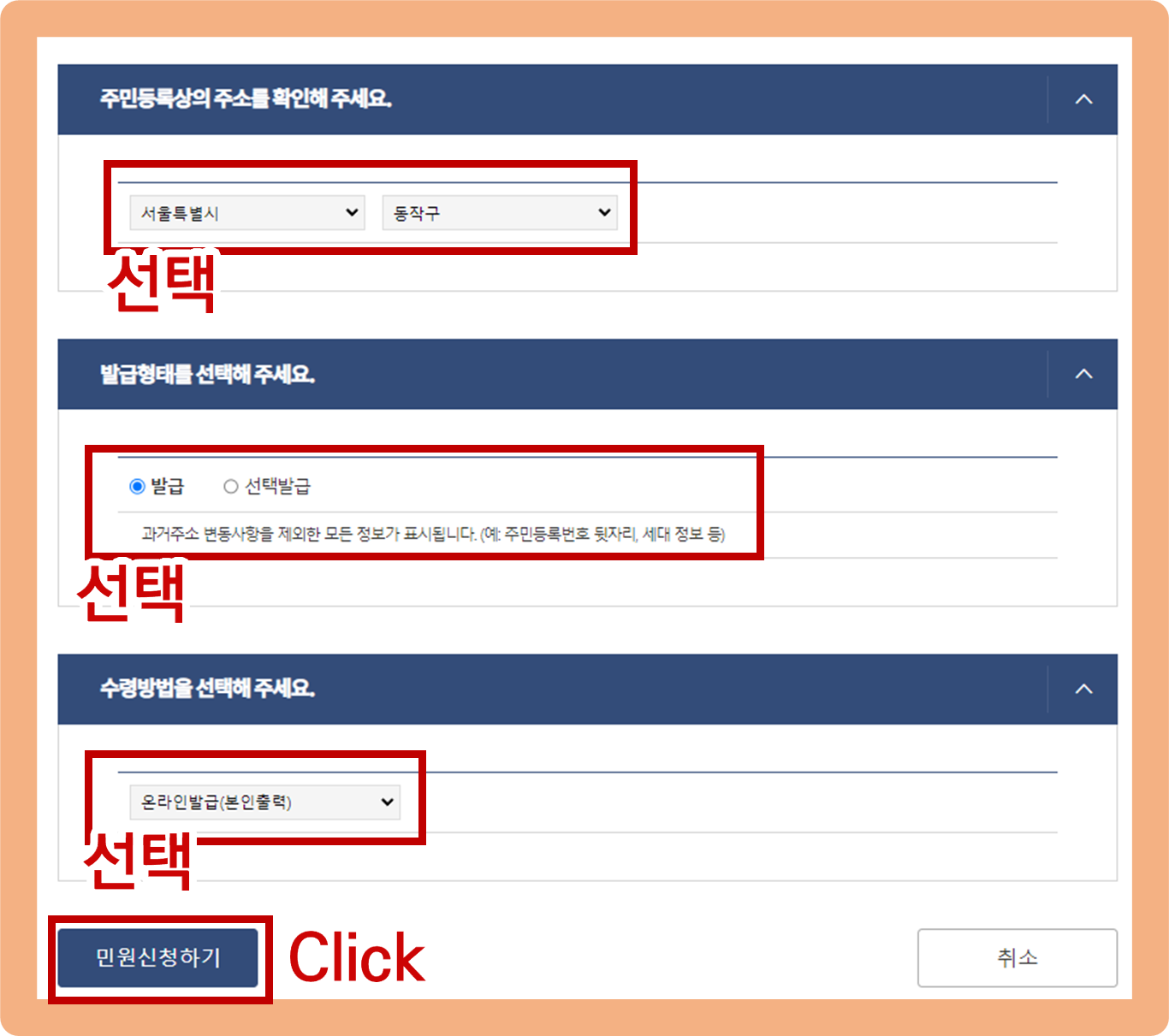 주민등록등본 인터넷발급, 주소, 발급 형태, 수령 방법 선택하기