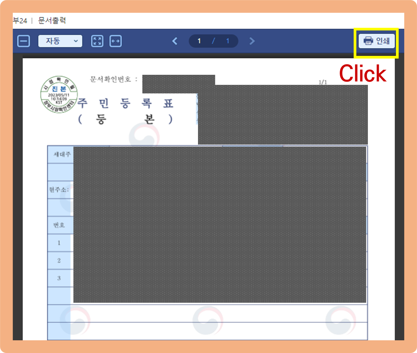 주민등록등본 인터넷발급, '문서출력' 클릭