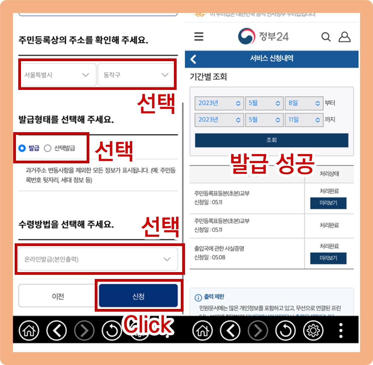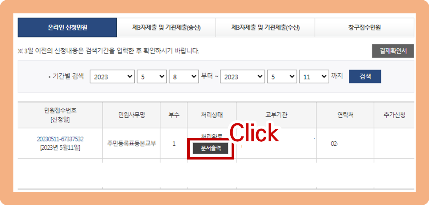 (오른쪽사진) 서류 발급이 완료되었습니다.