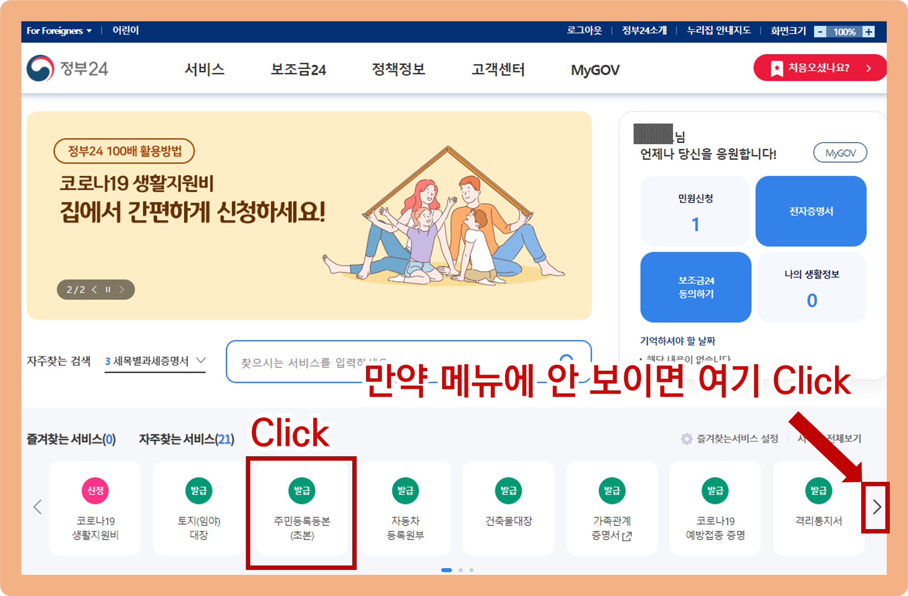여기서 '자주 찾는 서비스'에 보이는 '주민등록등본(초본)' 버튼을 눌러주세요.