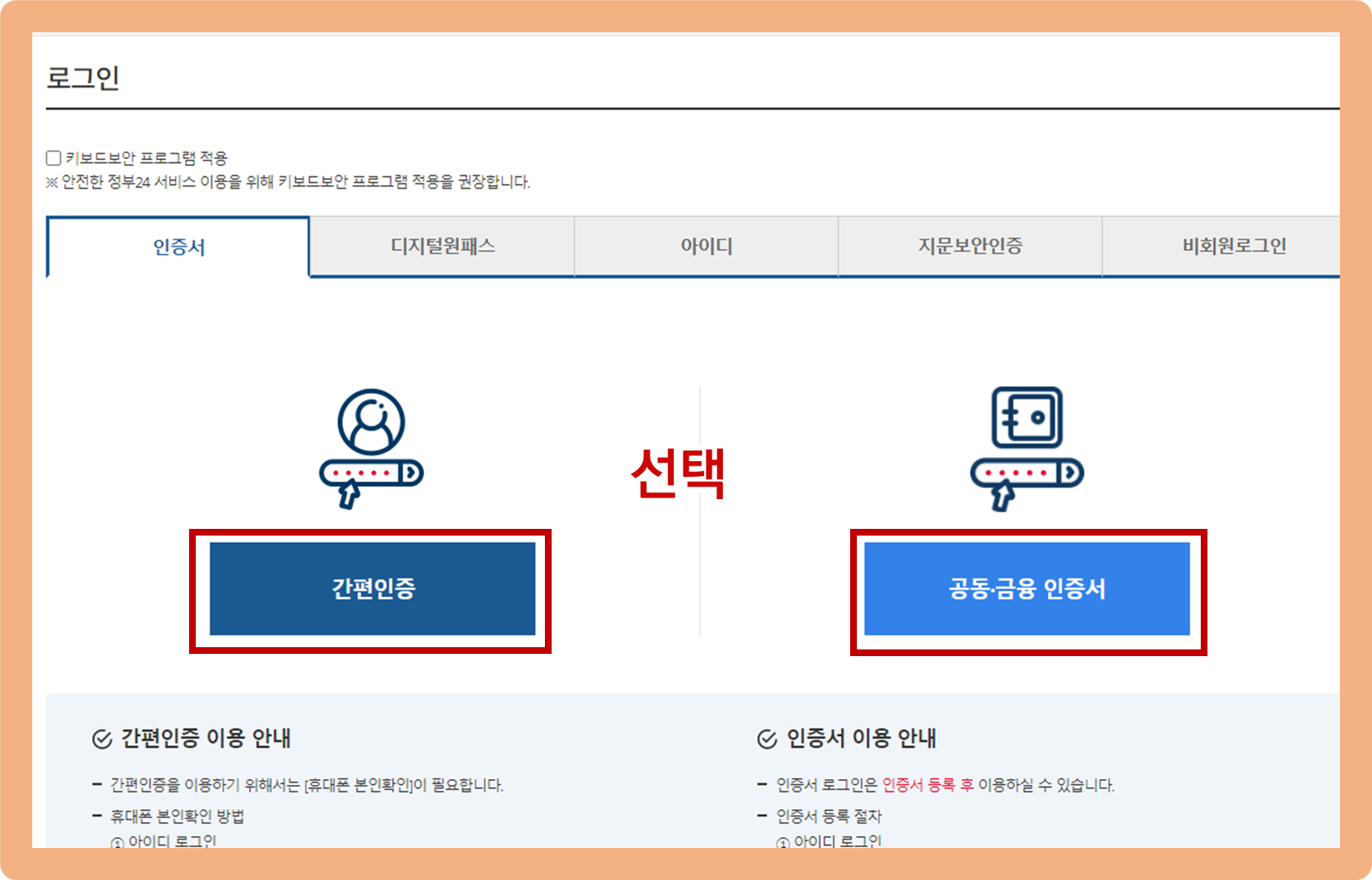 간편인증과 공동 및 금융 인증서 인증이 있는데요.