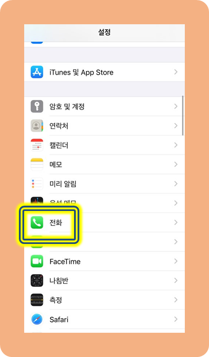 이 곳에서 아래쪽으로 조금만 스크롤하면 전화 메뉴가 보여요