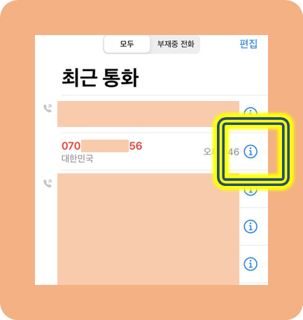 최근 통화 목록으로 이동하여 차단할 번호 옆의 i 아이콘을 클릭합니다.
